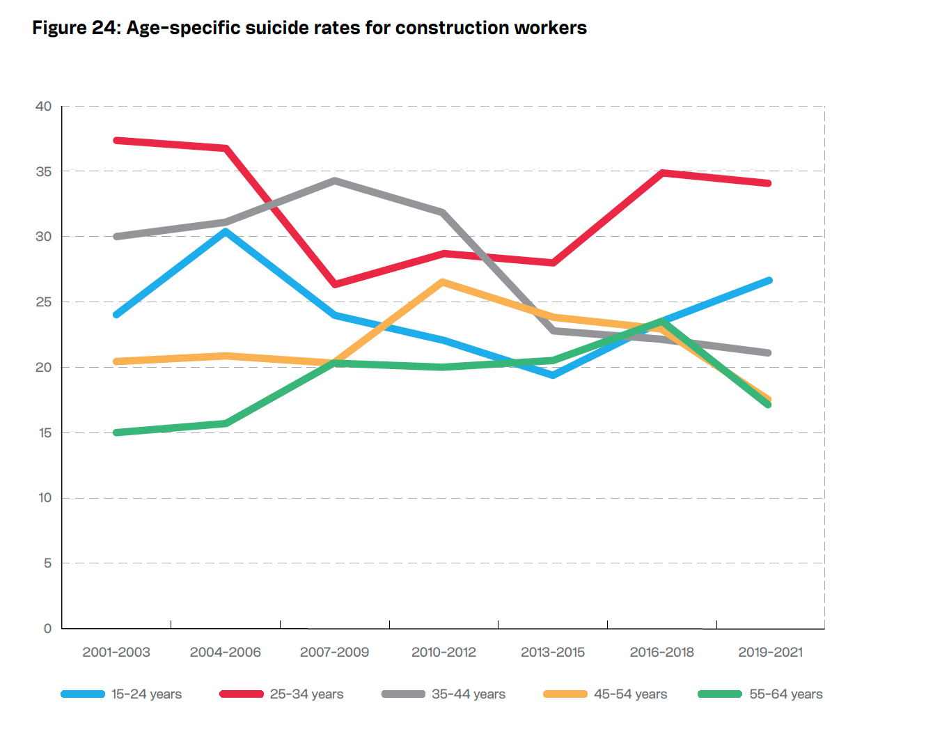 The Suicide in the Construction Industry, Volume 7, report also reveals that suicide rates among younger construction workers (aged 15-24) have been rising, contradicting the overall decline. Suicide remains the leading cause of death among Australians aged 15-24 and 25-44 with construction workers in these age groups at a heightened risk.